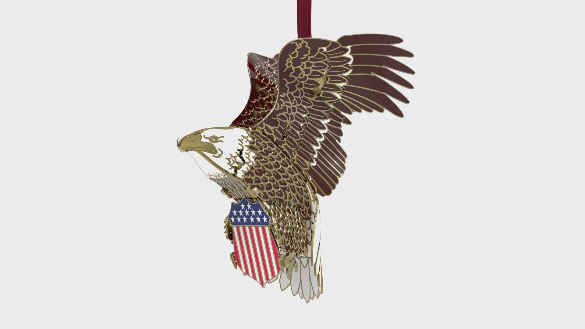 Perfect for your holiday tree, this is our American-made Bald Eagle Ornament. This three dimensional ornament is made from cut brass with a brass lacquer finish. The ornament depicts a bald eagle clutching an American flag shield in its talons. The eagle appears to be flying, with its wings spread behind it and tail feathers curved below.