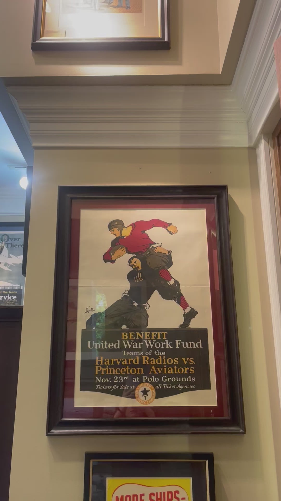 This is a very scarce WWI Work Relief Fund poster featuring the Harvard Radios competing against the Princeton Aviators. The game, held on November 23, 1918, was a benefit football game to raise money for the war effort.
