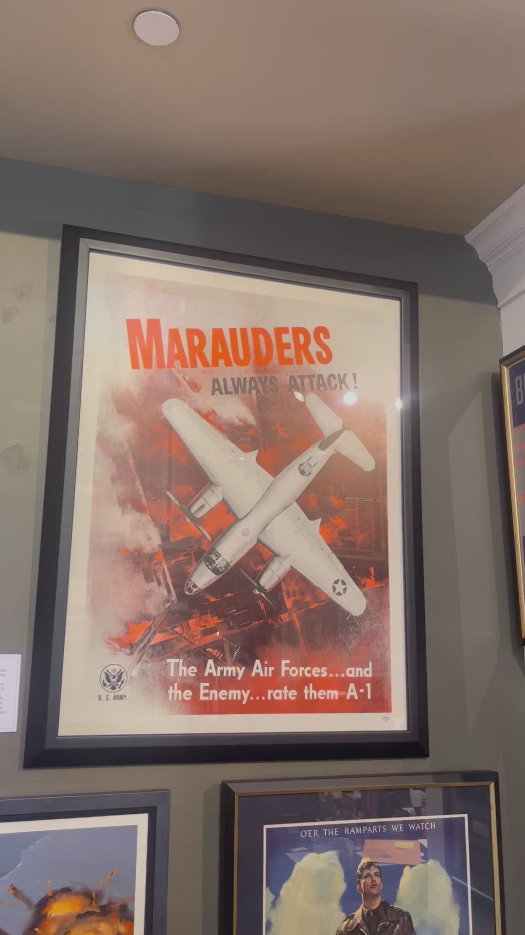 Presented is a vintage WWII U.S. Army poster of a Martin B-26 Marauder bomber plane. The poster was published by the Recruiting Publicity Bureau in 1943. The poster depicts a B-26 from above, dramatically hovering over a red-hued cityscape. The poster text reads, “Marauders Always Attack!” at top in red and black and “The Army Air Forces… and the enemy… rate them A-1” at bottom in white block letters.