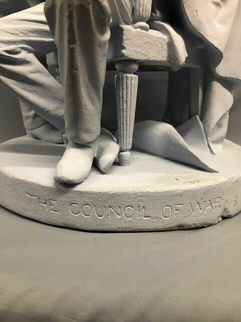 Presented is a rare plaster-cast sculpture entitled Council of War by artist John Rogers. Made a few years after the end of the Civil War, this sculpture depicts the three great Union leaders discussing military actions. President Lincoln studies a map at center, while General Grant points out his plans. Secretary of War Stanton listens from behind, wiping his glasses. These figures were placed together in the composition to signify the most powerful men by the end of the Civil War.